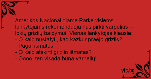 Amerikos Nacionaliniame Parke visiems lankytojams rekomenduoja nusipirkti varpelius – lokių grizlių baidymui. Vienas lankytojas klausia: