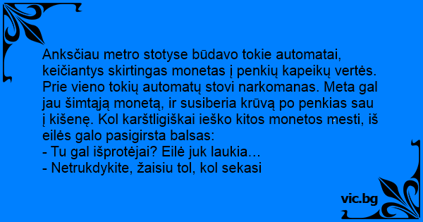Anksčiau metro stotyse būdavo tokie automatai, keičiantys skirtingas monetas į penkių kapeikų vertės. Prie vieno tokių automatų stovi narkomanas. Meta gal jau šimtąją monetą, ir susiberia krūvą po penkias sau į kišenę. Kol karštligiškai ieško kitos monetos mesti, iš eilės galo pasigirsta balsas: