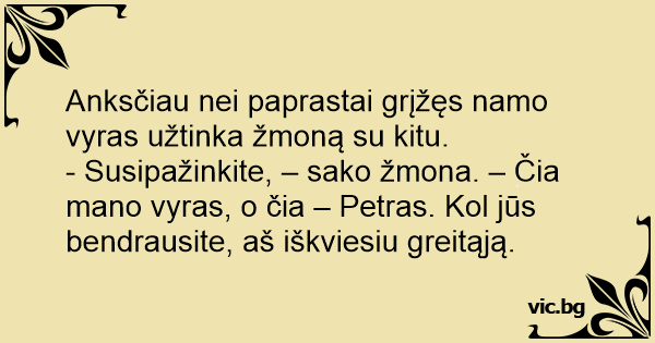 - Susipažinkite, – sako žmona. – Čia mano vyras, o čia – Petras. Kol jūs bendrausite, aš iškviesiu greitąją.