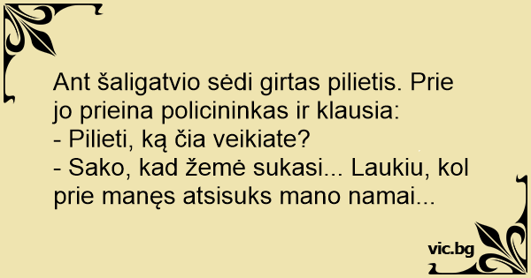 Ant šaligatvio sėdi girtas pilietis. Prie jo prieina policininkas ir klausia: