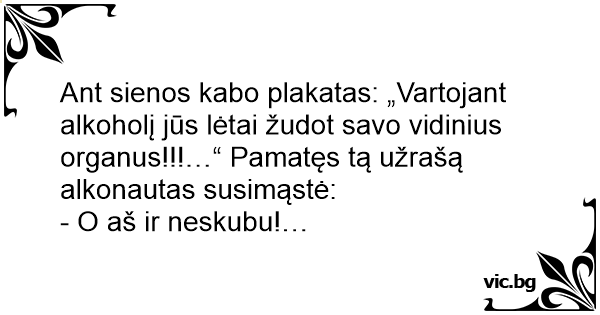 Ant sienos kabo plakatas: „Vartojant alkoholį jūs lėtai žudot savo vidinius organus!!!…“ Pamatęs tą užrašą alkonautas susimąstė: