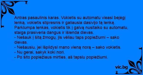 Antras pasaulinis karas. Vokietis su automatu vieasi bejėgį lenką, vokietis stipresnis ir galiausia dasivijo tą lenką. Parklumpa lenkas, vokietis tik į galvą nusitaiko su automatu, staiga prasiveria dangus ir išlenda dievas.