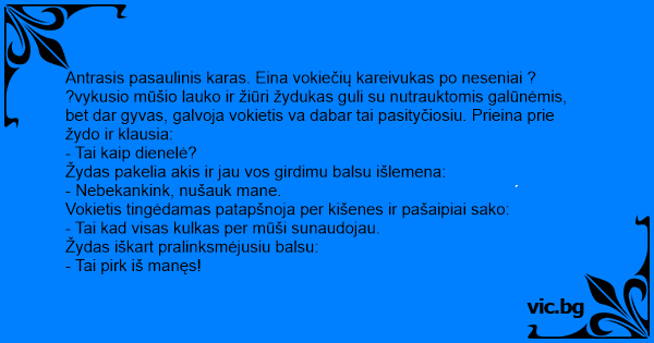 ?vykusio mūšio lauko ir žiūri žydukas guli su nutrauktomis galūnėmis, bet dar gyvas, galvoja vokietis va dabar tai pasityčiosiu. Prieina prie žydo ir klausia: