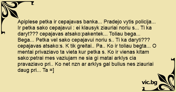 Apiplese petka ir cepajavas banka... Pradejo vytis policija... Ir petka sako cepajavui : ei klausyk ziauriai noriu s... Ti ka daryt??? cepajavas atsako:pakentek... Toliau bega... Bega... Petka vel sako cepajavui noriu s.. Ti ka daryti???cepajavas atsako:s. K tik greitai.. Pa.. Ko ir toliau begta... O mentai privaziavo ta vieta kur petka s. Ko ir vienas kitam sako:petrai mes vaziujam ne sia gi matai arklys cia pravaziavo pri.. Ko net nzn ar arklys gal bulius nes ziauriai daug pri... Ta =]