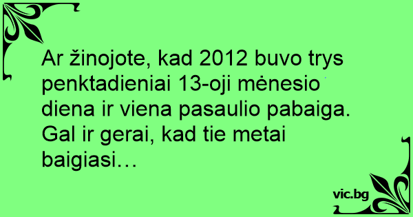 Ar žinojote, kad 2012 buvo trys penktadieniai 13-oji mėnesio diena ir viena pasaulio pabaiga. Gal ir gerai, kad tie metai baigiasi…