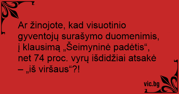 Ar žinojote, kad visuotinio gyventojų surašymo duomenimis, į klausimą „Šeimyninė padėtis“, net 74 proc. vyrų išdidžiai atsakė – „iš viršaus“?!