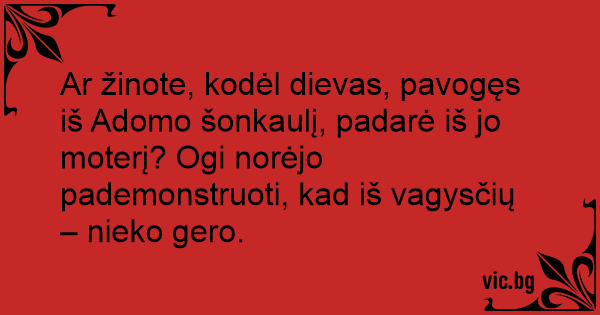 Ar žinote, kodėl dievas, pavogęs iš Adomo šonkaulį, padarė iš jo moterį? Ogi norėjo pademonstruoti, kad iš vagysčių – nieko gero.