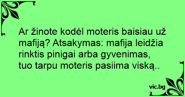 Ar žinote kodėl moteris baisiau už mafiją? Atsakymas: mafija leidžia rinktis pinigai arba gyvenimas, tuo tarpu moteris pasiima viską..