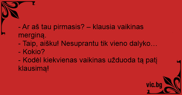 - Ar aš tau pirmasis? – klausia vaikinas merginą.
