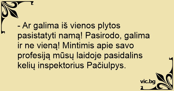 - Ar galima iš vienos plytos pasistatyti namą! Pasirodo, galima ir ne vieną! Mintimis apie savo profesiją mūsų laidoje pasidalins kelių inspektorius Pačiulpys.