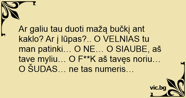 Ar galiu tau duoti mažą bučkį ant kaklo? Ar į lūpas?.. O VELNIAS tu man patinki… O NE… O SIAUBE, aš tave myliu… O F**K aš tavęs noriu… O ŠUDAS… ne tas numeris…