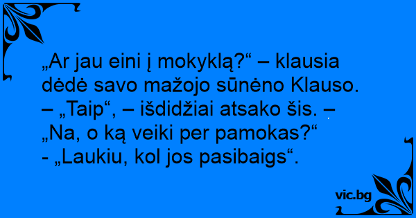 „Ar jau eini į mokyklą?“ – klausia dėdė savo mažojo sūnėno Klauso. – „Taip“, – išdidžiai atsako šis. – „Na, o ką veiki per pamokas?“