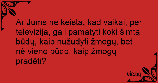 Ar Jums ne keista, kad vaikai, per televiziją, gali pamatyti kokį šimtą būdų, kaip nužudyti žmogų, bet nė vieno būdo, kaip žmogų pradėti?
