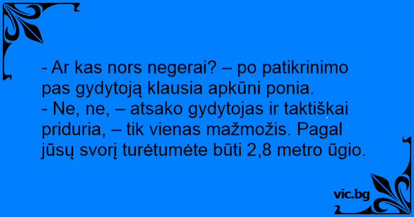 - Ne, ne, – atsako gydytojas ir taktiškai priduria, – tik vienas mažmožis. Pagal jūsų svorį turėtumėte būti 2,8 metro ūgio.