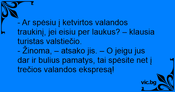 - Žinoma, – atsako jis. – O jeigu jus dar ir bulius pamatys, tai spėsite net į trečios valandos ekspresą!