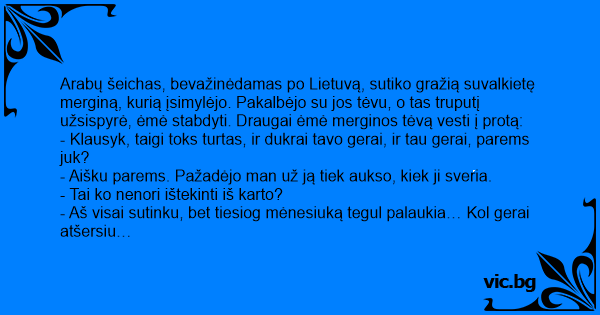 Arabų šeichas, bevažinėdamas po Lietuvą, sutiko gražią suvalkietę merginą, kurią įsimylėjo. Pakalbėjo su jos tėvu, o tas truputį užsispyrė, ėmė stabdyti. Draugai ėmė merginos tėvą vesti į protą:
