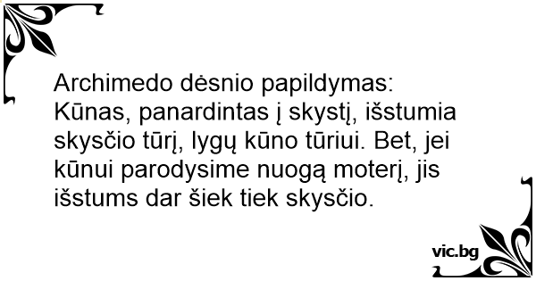 Kūnas, panardintas į skystį, išstumia skysčio tūrį, lygų kūno tūriui. Bet, jei kūnui parodysime nuogą moterį, jis išstums dar šiek tiek skysčio.