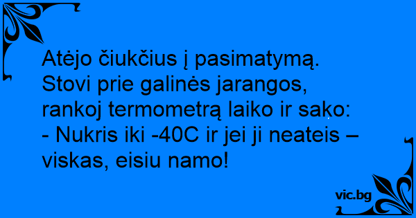 Atėjo čiukčius į pasimatymą. Stovi prie galinės jarangos, rankoj termometrą laiko ir sako: