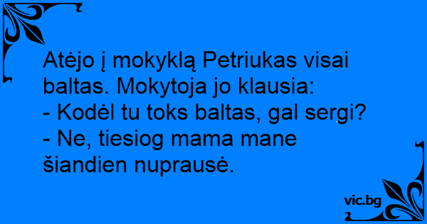 Atėjo į mokyklą Petriukas visai baltas. Mokytoja jo klausia:
