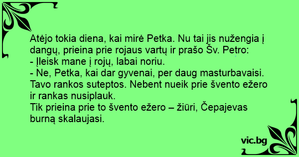 Atėjo tokia diena, kai mirė Petka. Nu tai jis nužengia į dangų, prieina prie rojaus vartų ir prašo Šv. Petro: