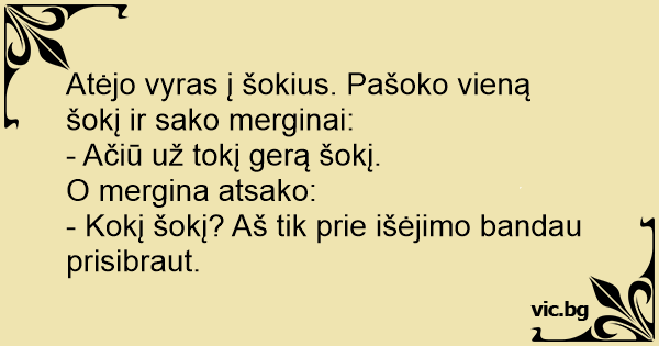 Atėjo vyras į šokius. Pašoko vieną šokį ir sako merginai: