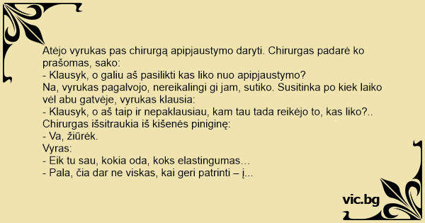 Atėjo vyrukas pas chirurgą apipjaustymo daryti. Chirurgas padarė ko prašomas, sako: