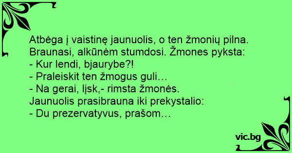 Atbėga į vaistinę jaunuolis, o ten žmonių pilna. Braunasi, alkūnėm stumdosi. Žmones pyksta: