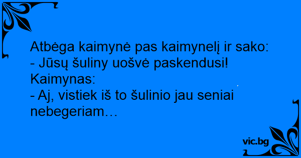 Atbėga kaimynė pas kaimynelį ir sako: