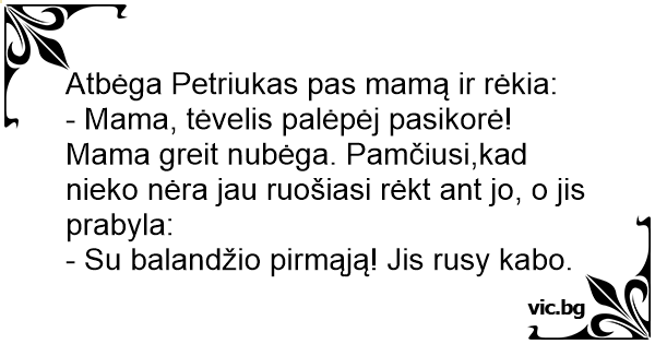 Mama greit nubėga. Pamčiusi,kad nieko nėra jau ruošiasi rėkt ant jo, o jis prabyla: