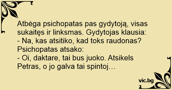 Atbėga psichopatas pas gydytoją, visas sukaitęs ir linksmas. Gydytojas klausia: