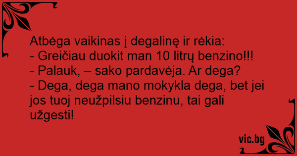 - Dega, dega mano mokykla dega, bet jei jos tuoj neužpilsiu benzinu, tai gali užgesti!