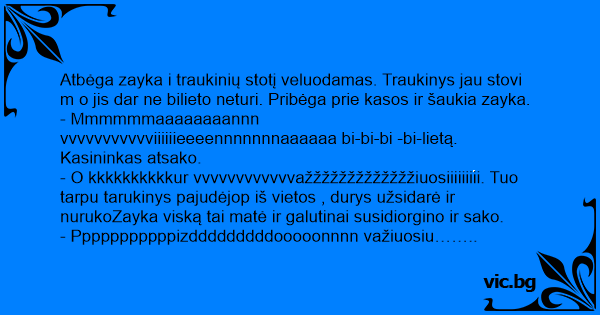 - O kkkkkkkkkkur vvvvvvvvvvvvažžžžžžžžžžžžžiuosiiiiiiiii. Tuo tarpu tarukinys pajudėjop iš vietos , durys užsidarė ir nurukoZayka viską tai matė ir galutinai susidiorgino ir sako.