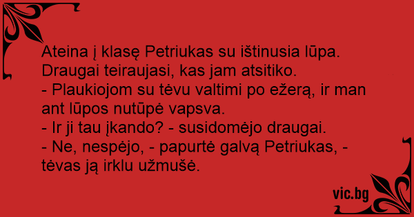 Ateina į klasę Petriukas su ištinusia lūpa. Draugai teiraujasi, kas jam atsitiko.
