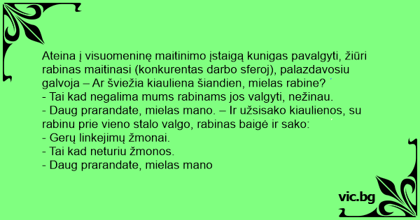 - Daug prarandate, mielas mano. – Ir užsisako kiaulienos, su rabinu prie vieno stalo valgo, rabinas baigė ir sako: