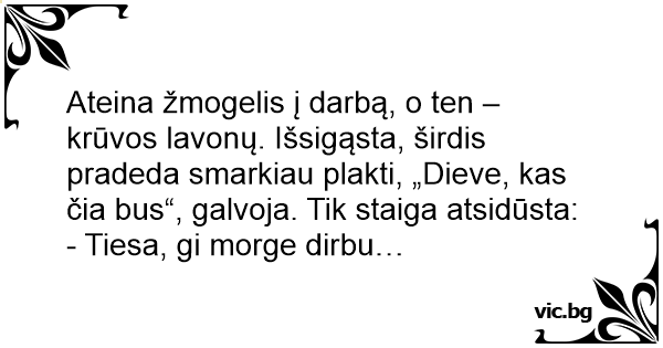 Ateina žmogelis į darbą, o ten – krūvos lavonų. Išsigąsta, širdis pradeda smarkiau plakti, „Dieve, kas čia bus“, galvoja. Tik staiga atsidūsta: