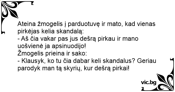 - Klausyk, ko tu čia dabar keli skandalus? Geriau parodyk man tą skyrių, kur dešrą pirkai!