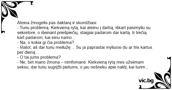 - Turiu problemą. Kiekvieną rytą, kai ateinu į darbą, iškart pasimyliu su sekretore, o išeinant priešpiečių, staigiai padarom dar kartą. Ir trečią kart padarom, kai einu namo…