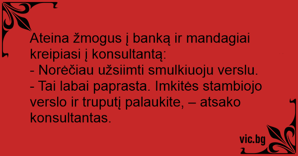 - Tai labai paprasta. Imkitės stambiojo verslo ir truputį palaukite, – atsako konsultantas.