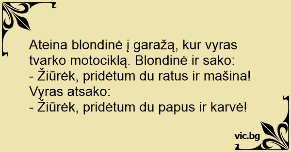 Ateina blondinė į garažą, kur vyras tvarko motociklą. Blondinė ir sako: