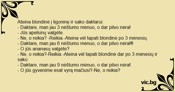 - Daktare, man jau 3 nėštumo mėnuo, o dar pilvo nėra!