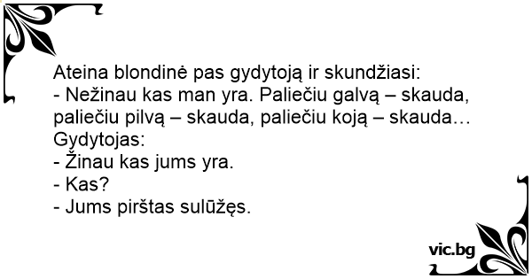 Ateina blondinė pas daktarą ir skundžiasi: - Gydytojau, man viską skauda. Paliečiu koją - skauda, paliečiu ranką - skauda. - Viskas aišku, ponia, jums pirštas lūžo.
