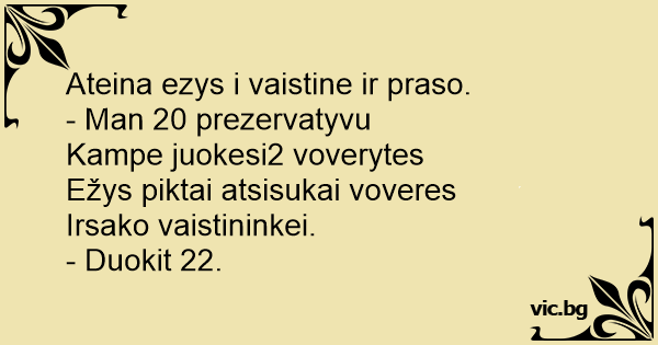 Ienāk vilks aptiekā un saka: Man lūdzu 60 prezervatīvus. Pēkšņi dzird ka stūrī smejas 2 zaķīši, viņš paskatās uz zaķīšiem, pagriežas atpakaļ pie aptiekāra un saka: Lai iet 62.