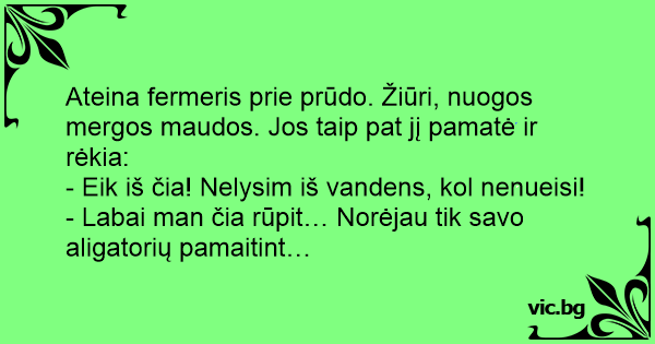 Ateina fermeris prie prūdo. Žiūri, nuogos mergos maudos. Jos taip pat jį pamatė ir rėkia: