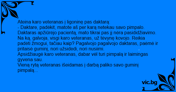 Daktaras apžiūrėjo pacientą, mato tikrai pas jį nėra pasididžiavimo. Na ką, galvoja, visgi karo veteranas, už tėvynę kovojo. Reikia padėti žmogui, tačiau kaip? Pagalvojo pagalvojo daktaras, paėmė ir pritaisė guminį, nori užsidedi, nori nusiimi.