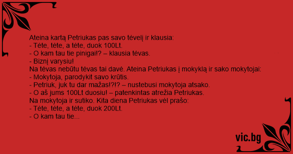 - O aš jums 100Lt duosiu! – patenkintas atrežia Petriukas.