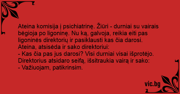 Ateina komisija į psichiatrinę. Žiūri - durniai su vairais bėgioja po ligoninę. Nu ką, galvoja, reikia eiti pas ligoninės direktorių ir pasiklausti kas čia darosi. Ateina, atsisėda ir sako direktoriui:
