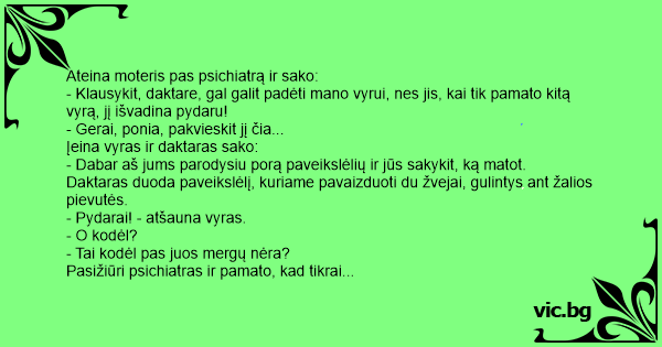 - Klausykit, daktare, gal galit padėti mano vyrui, nes jis, kai tik pamato kitą vyrą, jį išvadina pydaru!