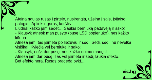 Miškas, šalta, sniegas aplink ir krūmai. Blin, galvoja rusas, nu ir papuoliau. Ir taip šikt užsinorėjo smarkiai… Nu galvoja, nieko nėra, atsisėdo prie krūmo, chalatą pakėlė ir stumia… Tik staiga pajaučia stiprų spyrį i nugarą, kurį palydi griežtas balsas: