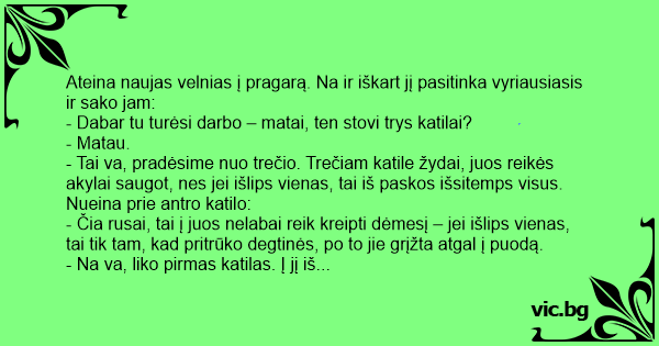 Ateina naujas velnias į pragarą. Na ir iškart jį pasitinka vyriausiasis ir sako jam: