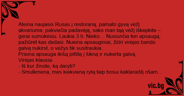 Ateina naujasis Rusas į restoraną, pamato gyvą vėžį akvariume, pakviečia padavėją, sako man tąą vėžį iškepkite – gerai sumokėsiu. Laukia 3 h. Nieko… Nusiunčia ten apsaugą, pažiūrėt kas dedasi. Nueina apsauginiai, žiūri virėjas bando galvą nukirst, o vėžys tik susitraukia…